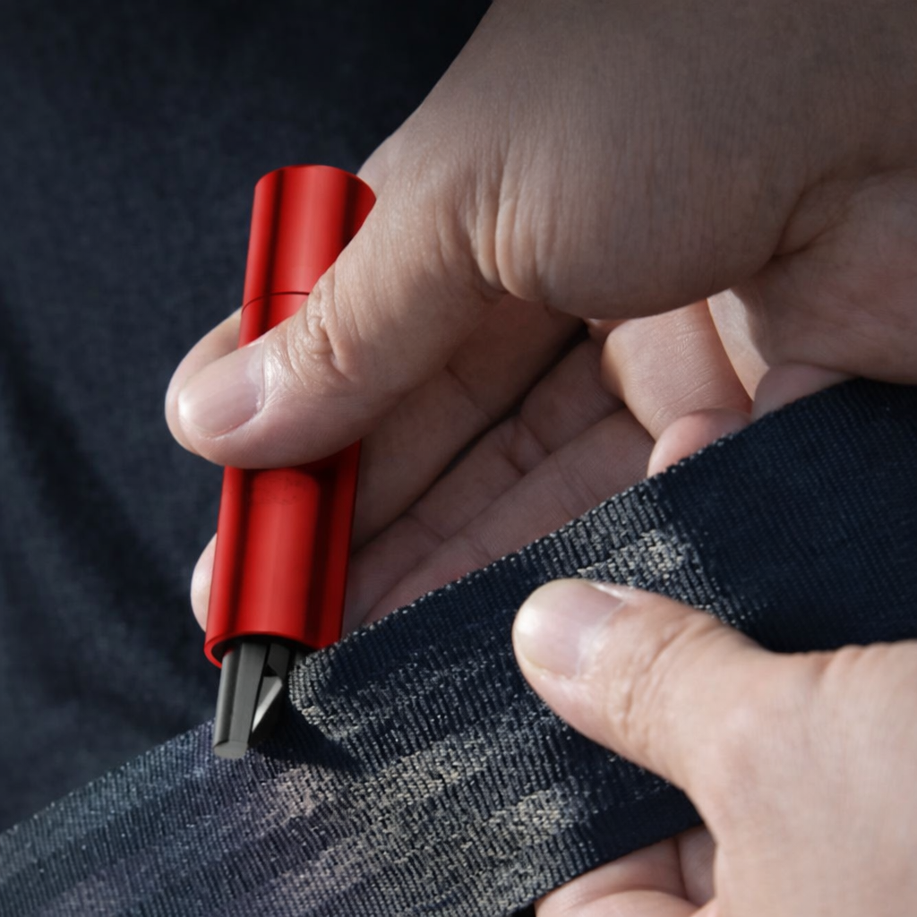 Expose the hidden blade, hook the seatbelt, and pull to cut through quickly and safely.